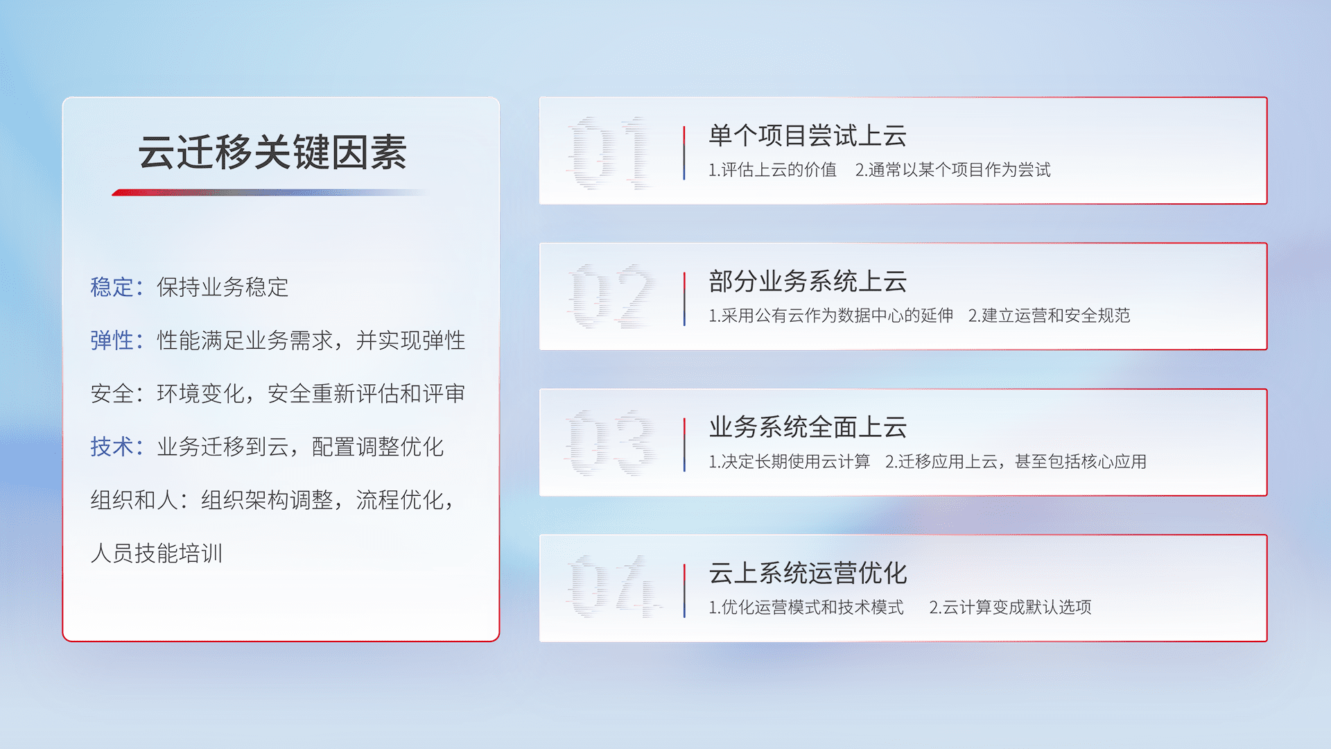 结合实际业务,,,从规划设计、、、、云平台选型、、云原生改造、、数据迁移、、集成交付,,,,迁移全过程为客户识别最佳上云路径,,,做好风险识别管理,,,设计网络架构、、、、身份权限、、、、安全审计合规、、、、操作审计、、、日志审计、、监控告警策略、、多站点容灾设计等,,,,对云上基础设施进行整体规划,,,提升IT治理水平,,以满足弹性、、、高可用、、、高性能的需求。。。