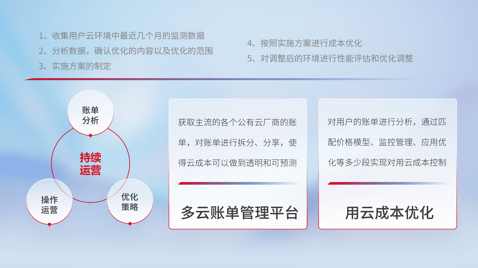 通过多云纳管,,以统一的资源数据模型把客户的云资源进行抽象和封装,,,进而实现对多云资源的统一操作,,,,保障云资源管理的可靠性、、、稳定性与可用性。。。。量身定制化运维内容,,,,配置、、、开发运维、、、、补丁管理、、、备份、、、监控、、、认证和访问管理、、、审计和日常巡检等,,保障在用云过程中的可靠度,,稳定度以及高可用率。。。。